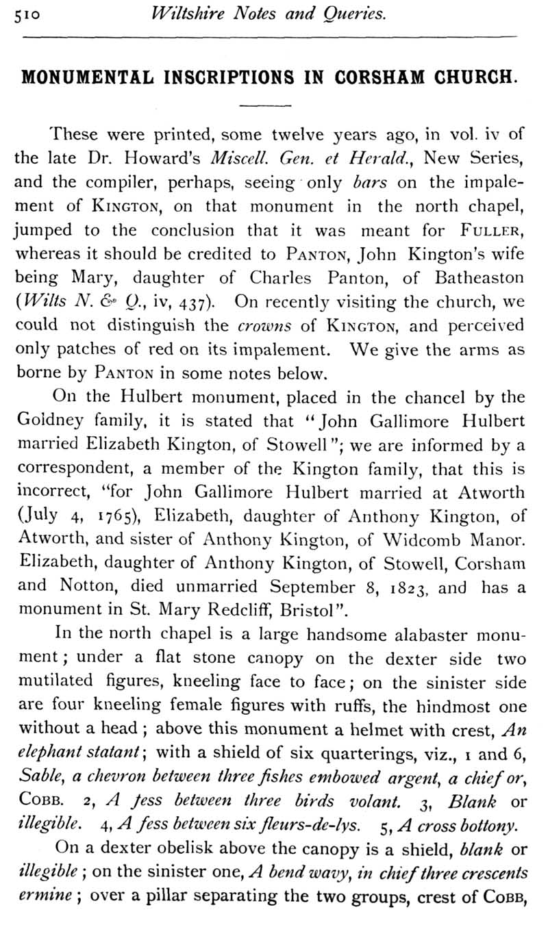 Chapter 12 Montacute, Earl of Salisbury; Records of Wiltshire Parishes; Quakerism in Wiltshire; Feet of Fines for Wiltshire; Sevenhampton; Eyre of Wilts; Eyre of Bromham; Monumental Inscriptions in Corsham Church; Blake; Miscellanea; The Polecat in Wiltshire; Queri