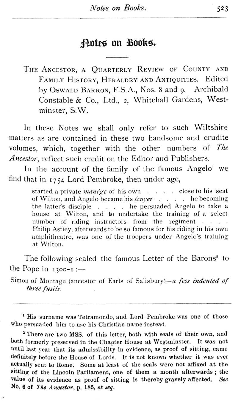 Chapter 12 Montacute, Earl of Salisbury; Records of Wiltshire Parishes; Quakerism in Wiltshire; Feet of Fines for Wiltshire; Sevenhampton; Eyre of Wilts; Eyre of Bromham; Monumental Inscriptions in Corsham Church; Blake; Miscellanea; The Polecat in Wiltshire; Queri