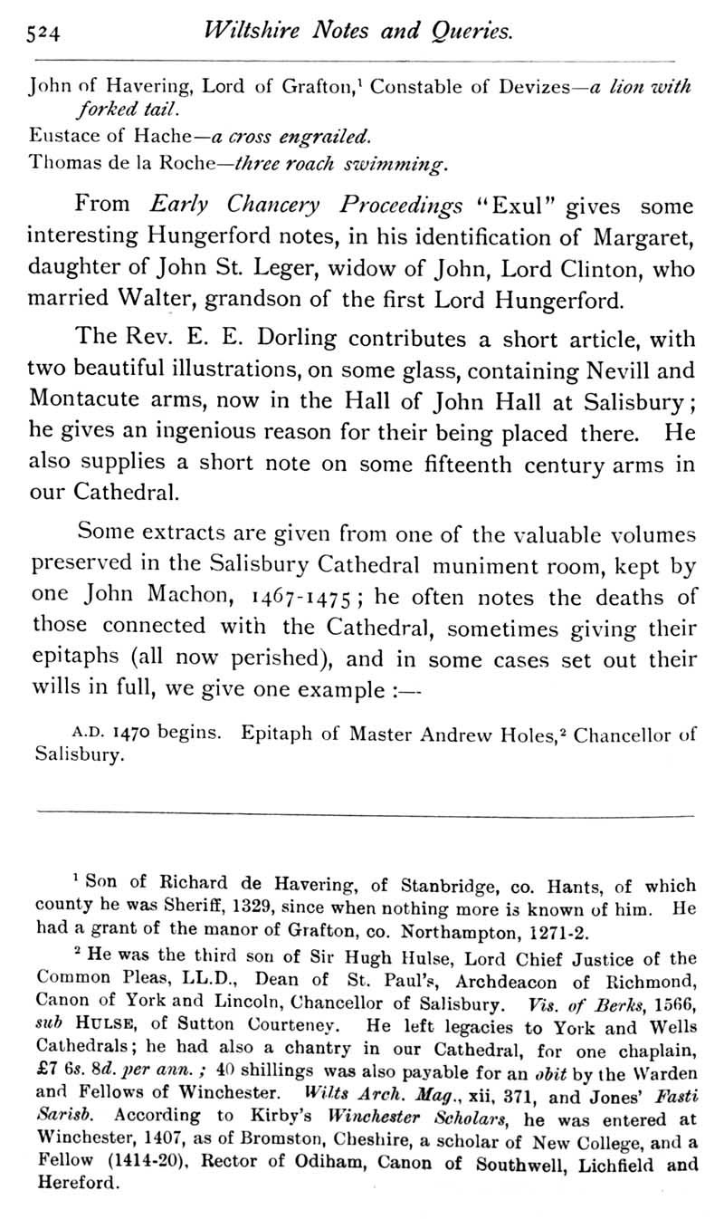Chapter 12 Montacute, Earl of Salisbury; Records of Wiltshire Parishes; Quakerism in Wiltshire; Feet of Fines for Wiltshire; Sevenhampton; Eyre of Wilts; Eyre of Bromham; Monumental Inscriptions in Corsham Church; Blake; Miscellanea; The Polecat in Wiltshire; Queri