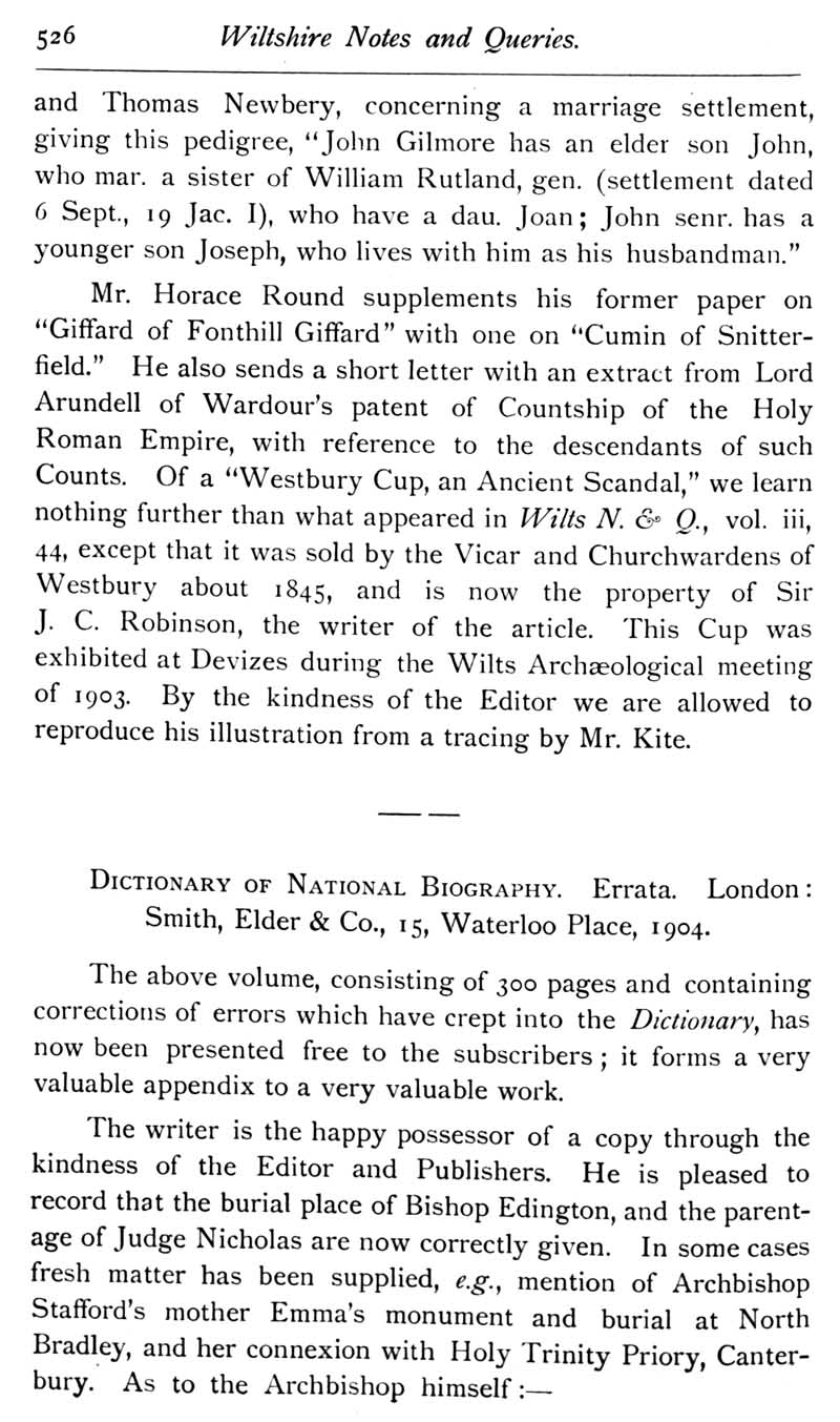 Chapter 12 Montacute, Earl of Salisbury; Records of Wiltshire Parishes; Quakerism in Wiltshire; Feet of Fines for Wiltshire; Sevenhampton; Eyre of Wilts; Eyre of Bromham; Monumental Inscriptions in Corsham Church; Blake; Miscellanea; The Polecat in Wiltshire; Queri