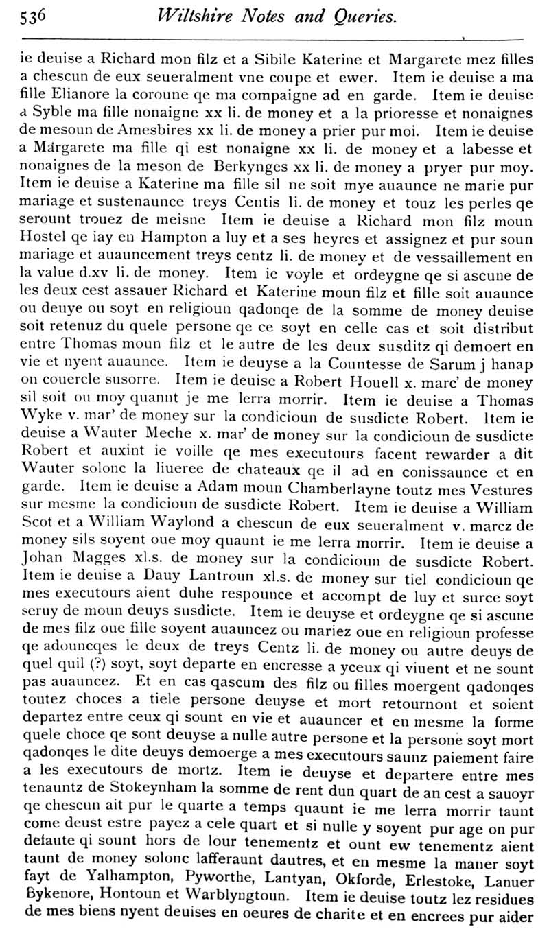 Chapter 13 Montacute, Earl of Salisbury; Records of Wiltshire Parishes; Quakerism in Wiltshire; Feet of Fines for Wiltshire; Eyre of Wiltshire; Will of Andrew Holes; Sarum; Panton and Selfe; Queries; Replies; Notes on Books; Index; Index of Persons; Index of Places