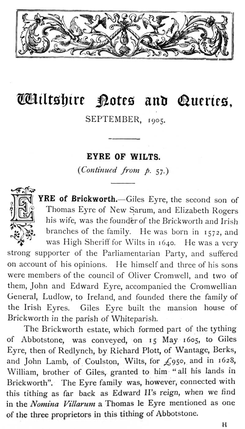 Chapter 4 Eyre of Wiltshire; Records of Wiltshire Parishes: Urchfont with Stert; Quakerism in Wiltshire; Wiltshire Wills; Edington; Fisherton Gaol and its Occupants in 1649; Queries; Replies.