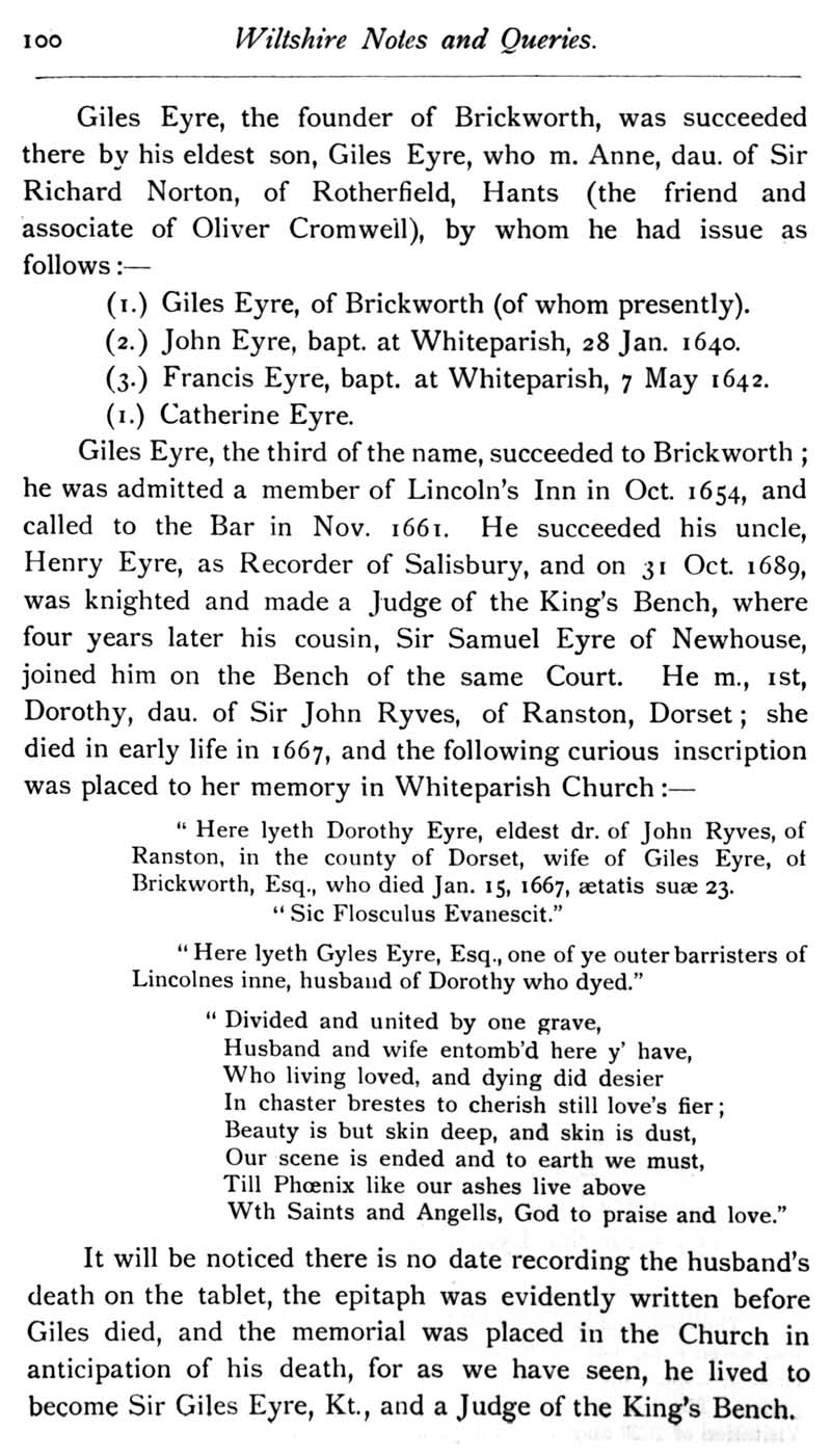 Chapter 4 Eyre of Wiltshire; Records of Wiltshire Parishes: Urchfont with Stert; Quakerism in Wiltshire; Wiltshire Wills; Edington; Fisherton Gaol and its Occupants in 1649; Queries; Replies.