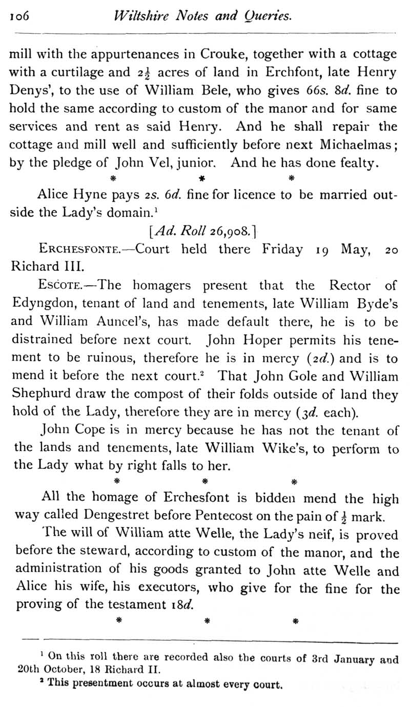 Chapter 4 Eyre of Wiltshire; Records of Wiltshire Parishes: Urchfont with Stert; Quakerism in Wiltshire; Wiltshire Wills; Edington; Fisherton Gaol and its Occupants in 1649; Queries; Replies.