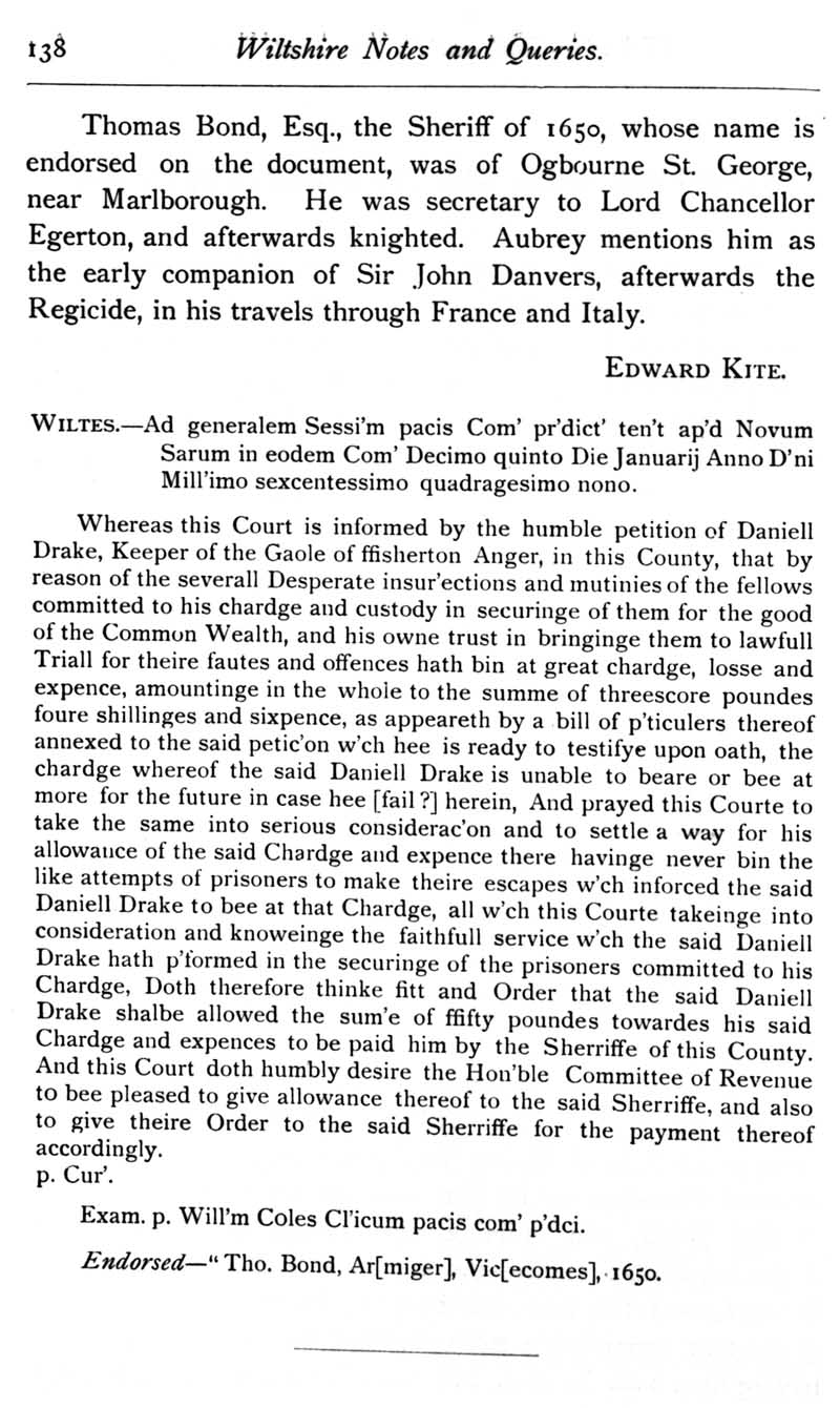 Chapter 4 Eyre of Wiltshire; Records of Wiltshire Parishes: Urchfont with Stert; Quakerism in Wiltshire; Wiltshire Wills; Edington; Fisherton Gaol and its Occupants in 1649; Queries; Replies.