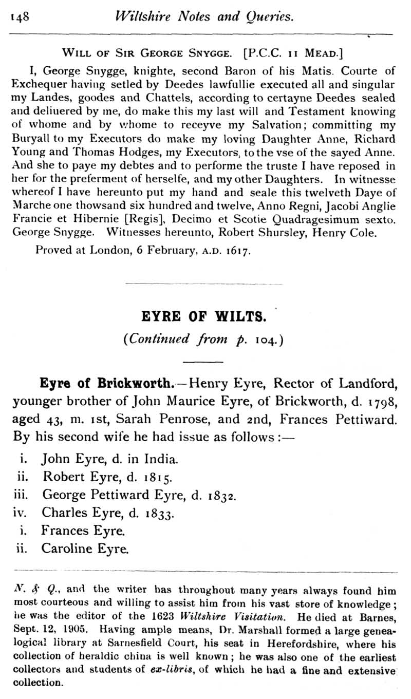 Chapter 5 Snigg; Eyre of Wiltshire; Records of Wiltshire Parishes: Urchfont with Stert; Chippenham Parish Church; Quakerism in Wiltshire; Feet of Fines for Wiltshire; Wiltshire Wills; A lsit of Wiltshire Portraits; Queries; Replies.