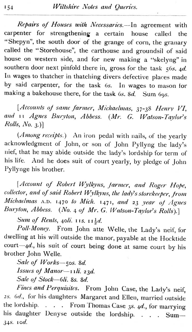 Chapter 5 Snigg; Eyre of Wiltshire; Records of Wiltshire Parishes: Urchfont with Stert; Chippenham Parish Church; Quakerism in Wiltshire; Feet of Fines for Wiltshire; Wiltshire Wills; A lsit of Wiltshire Portraits; Queries; Replies.