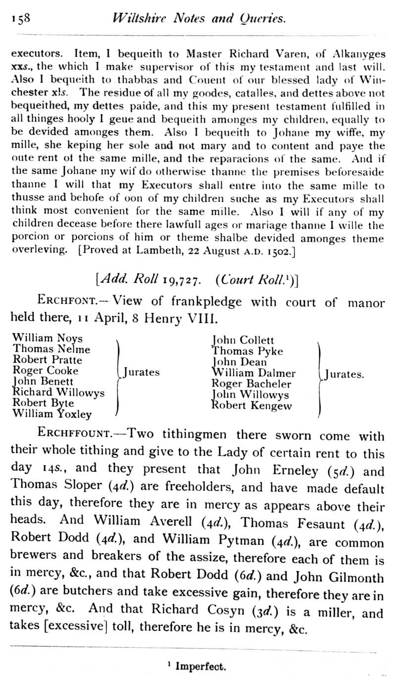 Chapter 5 Snigg; Eyre of Wiltshire; Records of Wiltshire Parishes: Urchfont with Stert; Chippenham Parish Church; Quakerism in Wiltshire; Feet of Fines for Wiltshire; Wiltshire Wills; A lsit of Wiltshire Portraits; Queries; Replies.