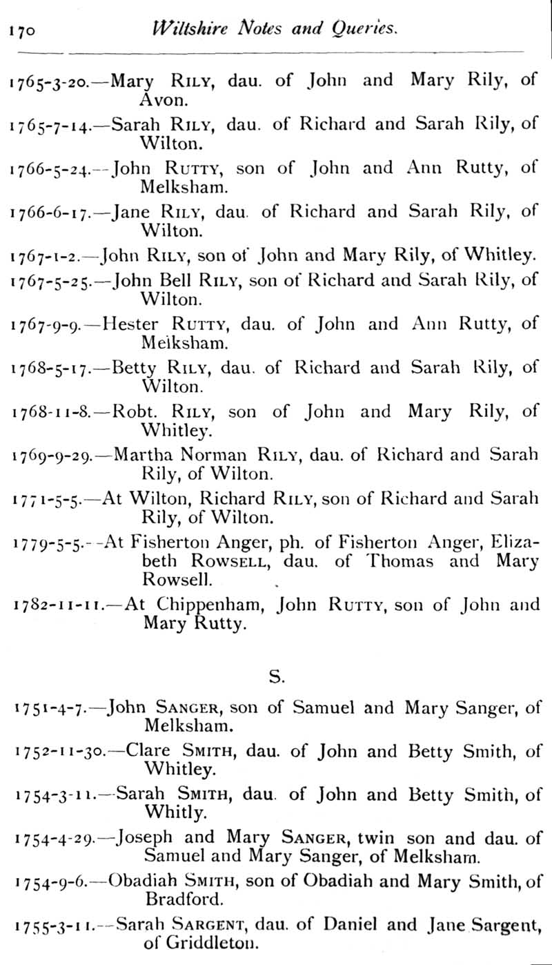 Chapter 5 Snigg; Eyre of Wiltshire; Records of Wiltshire Parishes: Urchfont with Stert; Chippenham Parish Church; Quakerism in Wiltshire; Feet of Fines for Wiltshire; Wiltshire Wills; A lsit of Wiltshire Portraits; Queries; Replies.