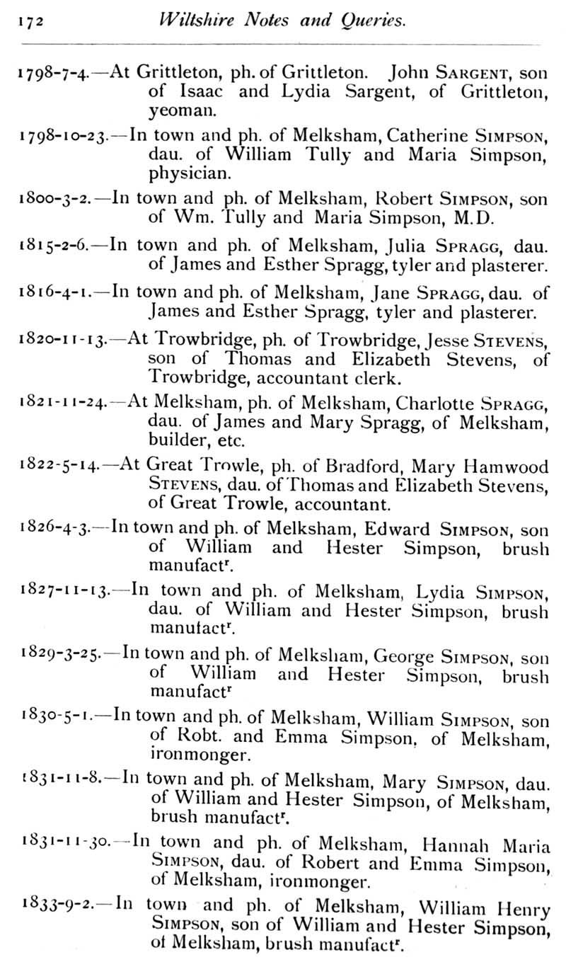 Chapter 5 Snigg; Eyre of Wiltshire; Records of Wiltshire Parishes: Urchfont with Stert; Chippenham Parish Church; Quakerism in Wiltshire; Feet of Fines for Wiltshire; Wiltshire Wills; A lsit of Wiltshire Portraits; Queries; Replies.