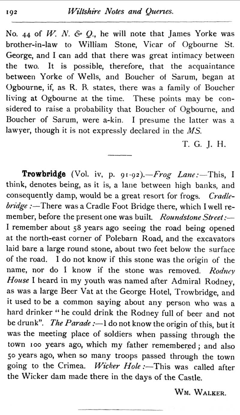 Chapter 5 Snigg; Eyre of Wiltshire; Records of Wiltshire Parishes: Urchfont with Stert; Chippenham Parish Church; Quakerism in Wiltshire; Feet of Fines for Wiltshire; Wiltshire Wills; A lsit of Wiltshire Portraits; Queries; Replies.