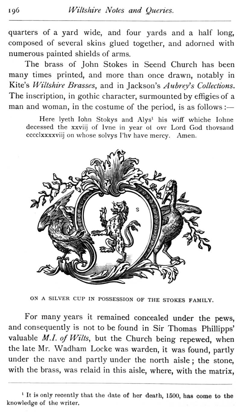 Chapter 6 Stokes of Seend; Records of Wiltshire Parishes: Urchfont with Stert; Wiltshire Wills; Eyre of Wiltshire; Quakerism in Wiltshire; The Great Election Contest for Wiltshire in 1772; Corriatt and Saint Barbe; Cartularies of Wilts Abbeys etc.; Queries; Replies