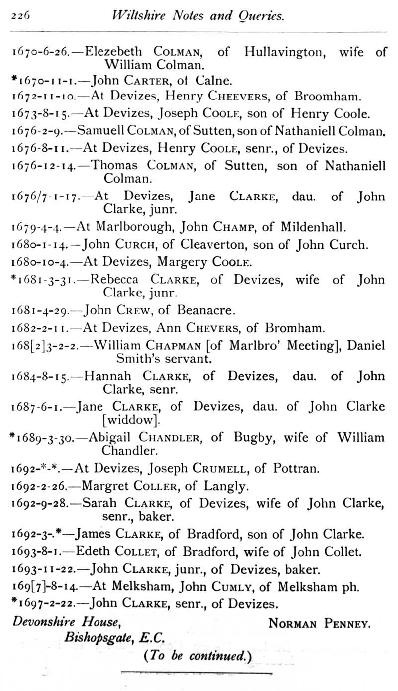 Chapter 6 Stokes of Seend; Records of Wiltshire Parishes: Urchfont with Stert; Wiltshire Wills; Eyre of Wiltshire; Quakerism in Wiltshire; The Great Election Contest for Wiltshire in 1772; Corriatt and Saint Barbe; Cartularies of Wilts Abbeys etc.; Queries; Replies