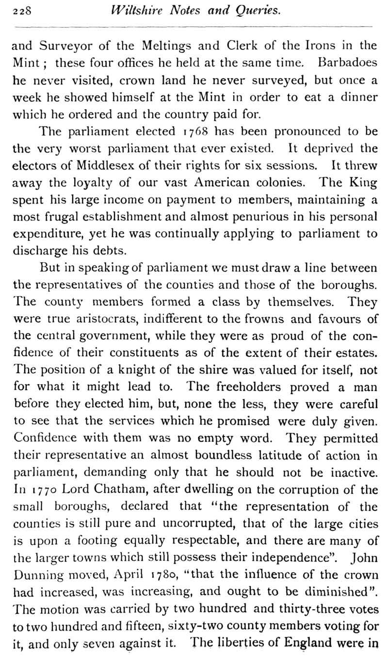 Chapter 6 Stokes of Seend; Records of Wiltshire Parishes: Urchfont with Stert; Wiltshire Wills; Eyre of Wiltshire; Quakerism in Wiltshire; The Great Election Contest for Wiltshire in 1772; Corriatt and Saint Barbe; Cartularies of Wilts Abbeys etc.; Queries; Replies
