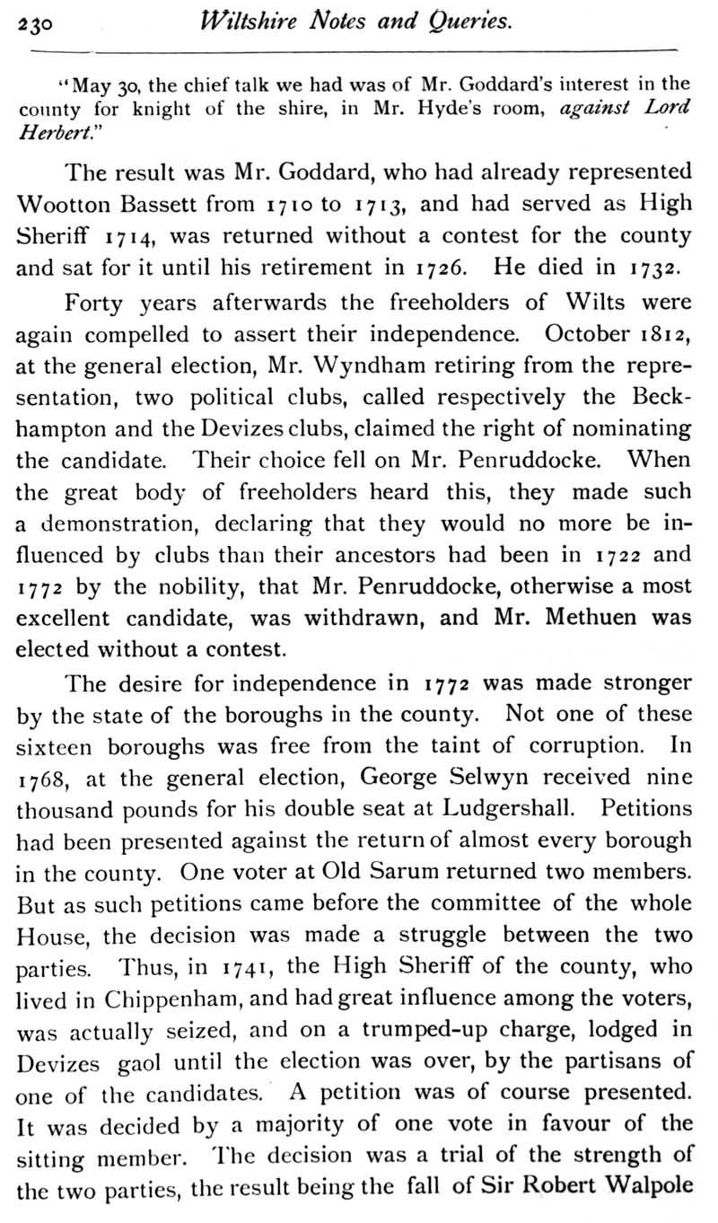 Chapter 6 Stokes of Seend; Records of Wiltshire Parishes: Urchfont with Stert; Wiltshire Wills; Eyre of Wiltshire; Quakerism in Wiltshire; The Great Election Contest for Wiltshire in 1772; Corriatt and Saint Barbe; Cartularies of Wilts Abbeys etc.; Queries; Replies