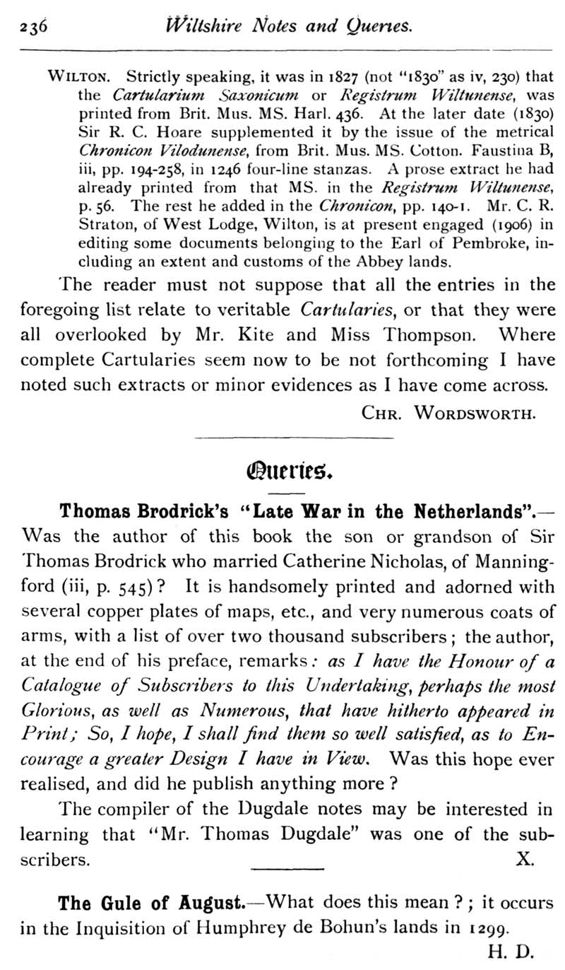 Page 44 Cartularies of Wilts Abbeys;Queries: Thomas Brodick's 'Late War in the Netherlands'; The Gule of August