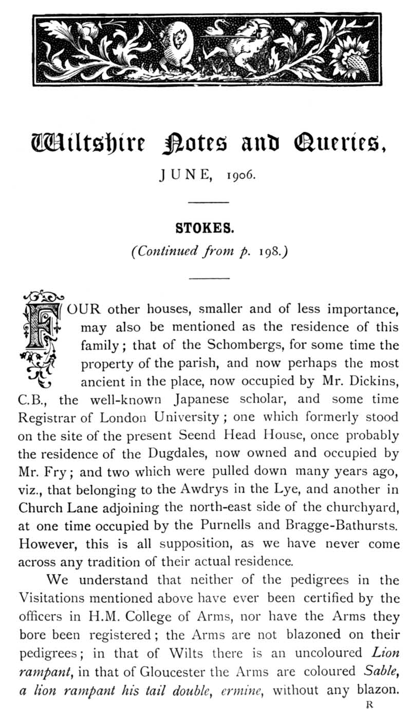 Chapter 7 Stokes; Records of Wiltshire Parishes: Urchfont with Stert; Tothill; Wiltshire Wills; Eyre of Wilts; Quakerism in Wiltshire; Corrody; Sarum Use; Queries; Replies; Notes on Books.