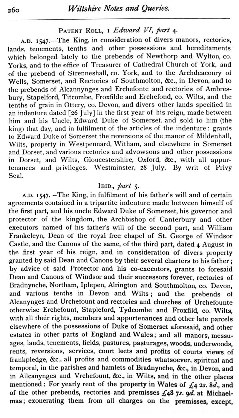 Chapter 7 Stokes; Records of Wiltshire Parishes: Urchfont with Stert; Tothill; Wiltshire Wills; Eyre of Wilts; Quakerism in Wiltshire; Corrody; Sarum Use; Queries; Replies; Notes on Books.