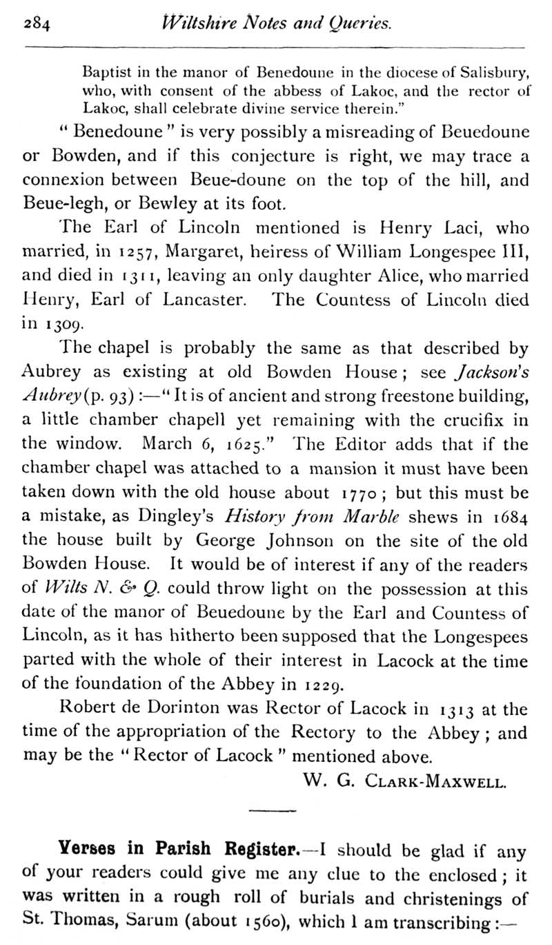 Page 44 ,Queries: The Chapel at Bowden near Lacock; Verses in Parish Registers