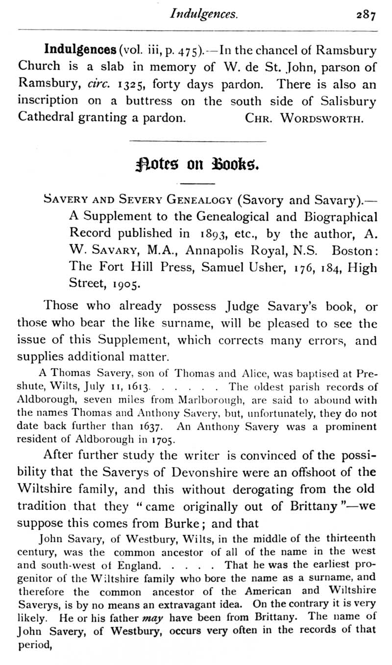 Page 47 Replies: Indulgences;,Notes on Books: Savery and Severy Genealogy