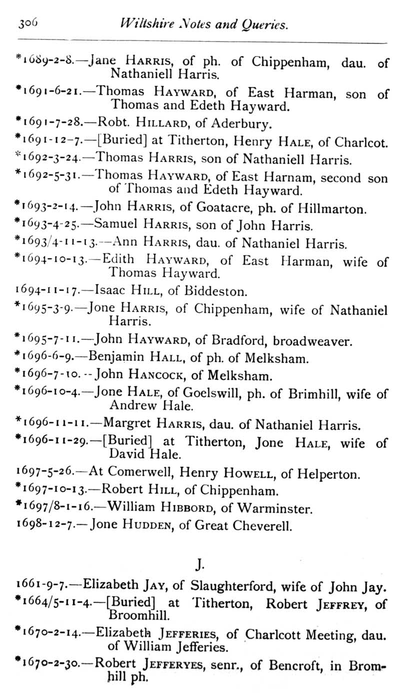 Chapter 8 Stokes; Records of Wiltshire Parishes: Urchfont with Stert; A List of Wiltshire Portraits; Quakerism in Wiltshire; Some Wiltshire Springs and Holy Wells; Eyre of Wilts; Wiltshire Wills; Feet of Fines for Wiltshire; Monumental Brass to the Grandfather of J