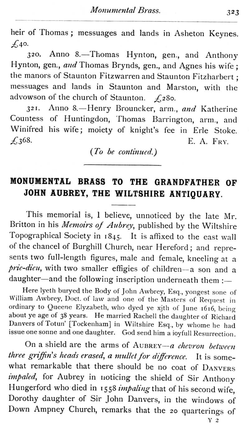 Page 37 Calendar of Feet of Fines for Wiltshire;,Monumental Brass to the Grandfather of John Aubrey, the Wiltshire Antiquary