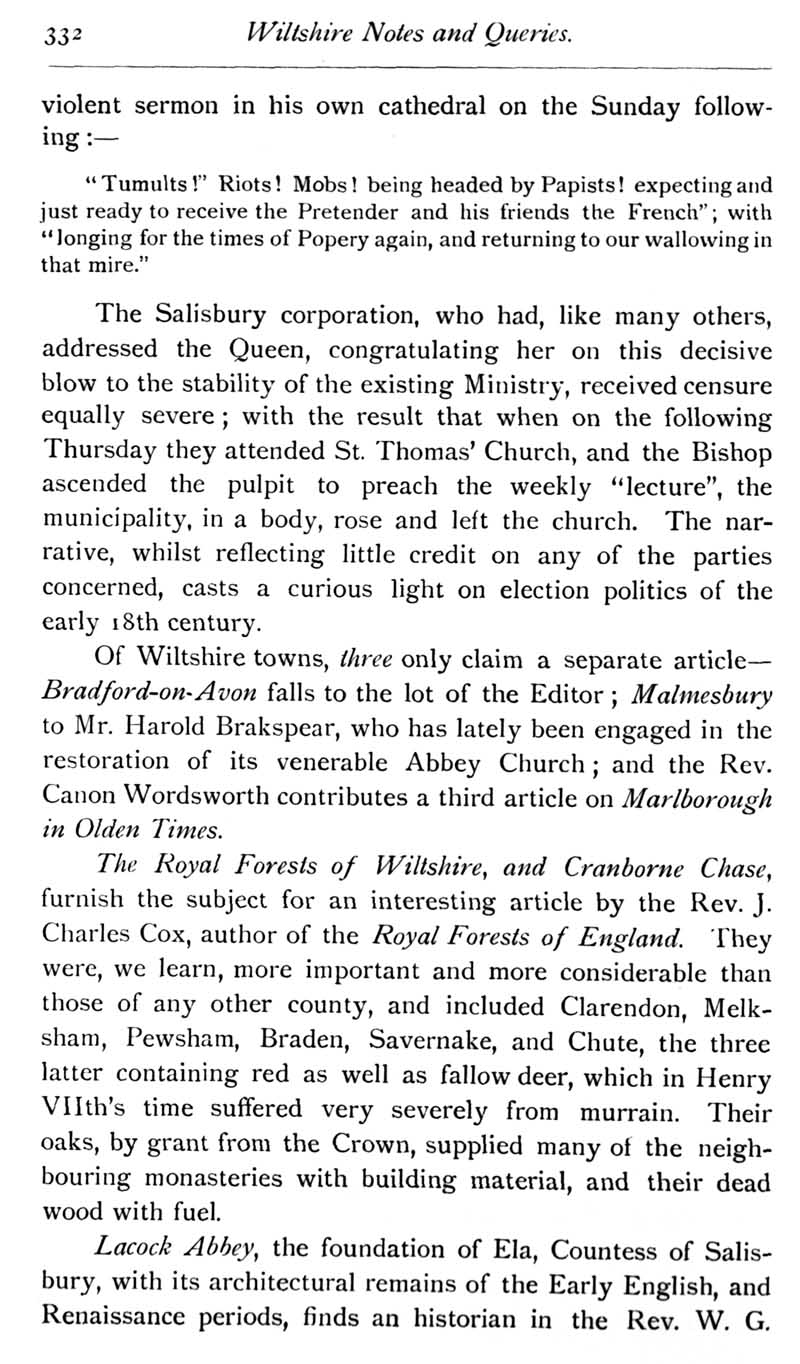 Chapter 8 Stokes; Records of Wiltshire Parishes: Urchfont with Stert; A List of Wiltshire Portraits; Quakerism in Wiltshire; Some Wiltshire Springs and Holy Wells; Eyre of Wilts; Wiltshire Wills; Feet of Fines for Wiltshire; Monumental Brass to the Grandfather of J