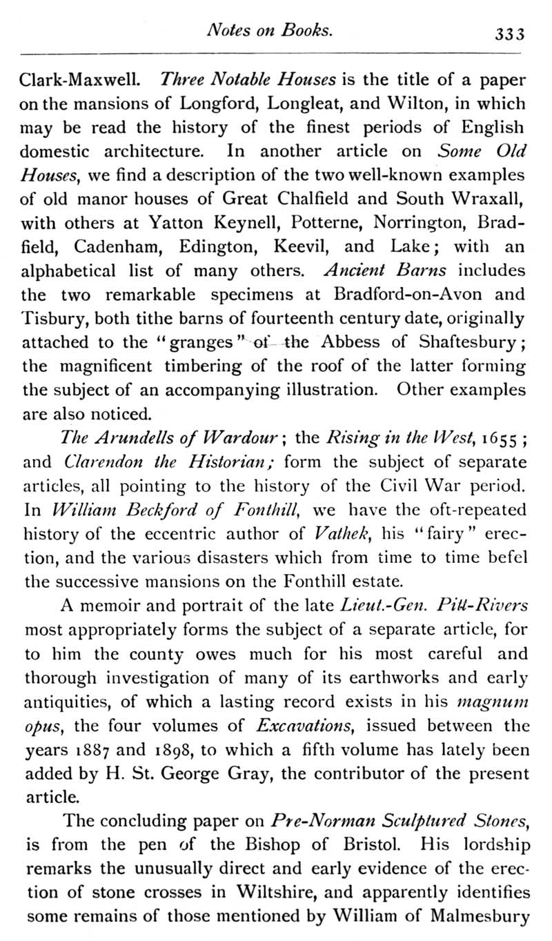 Chapter 8 Stokes; Records of Wiltshire Parishes: Urchfont with Stert; A List of Wiltshire Portraits; Quakerism in Wiltshire; Some Wiltshire Springs and Holy Wells; Eyre of Wilts; Wiltshire Wills; Feet of Fines for Wiltshire; Monumental Brass to the Grandfather of J