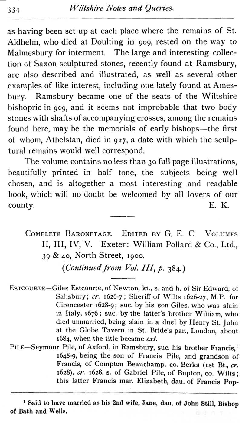 Chapter 8 Stokes; Records of Wiltshire Parishes: Urchfont with Stert; A List of Wiltshire Portraits; Quakerism in Wiltshire; Some Wiltshire Springs and Holy Wells; Eyre of Wilts; Wiltshire Wills; Feet of Fines for Wiltshire; Monumental Brass to the Grandfather of J
