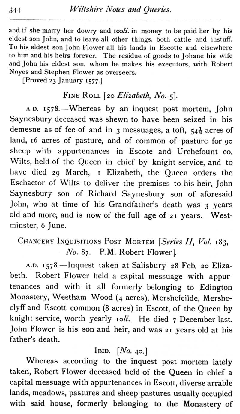 Chapter 9 Lacock Abbey; Records of Wiltshire Parishes: Urchfont with Stert; Eyre of Wilts; Stokes; Feet of Fines; Wiltshire Wills; Quakerism in Wiltshire; J. Aubrey's \"Remains of Gentilisme and Judaisme\" 1687; Registers of Somerset House Chapel 1712-1775; Queries;