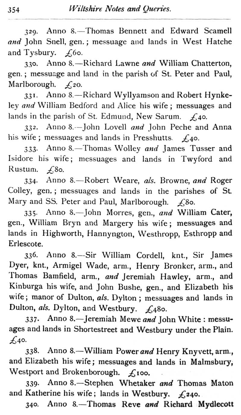 Chapter 9 Lacock Abbey; Records of Wiltshire Parishes: Urchfont with Stert; Eyre of Wilts; Stokes; Feet of Fines; Wiltshire Wills; Quakerism in Wiltshire; J. Aubrey's \"Remains of Gentilisme and Judaisme\" 1687; Registers of Somerset House Chapel 1712-1775; Queries;