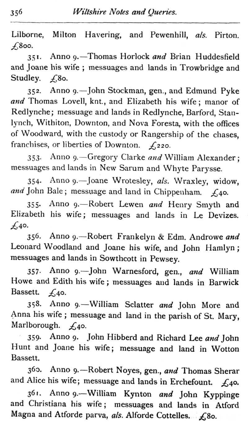 Chapter 9 Lacock Abbey; Records of Wiltshire Parishes: Urchfont with Stert; Eyre of Wilts; Stokes; Feet of Fines; Wiltshire Wills; Quakerism in Wiltshire; J. Aubrey's \"Remains of Gentilisme and Judaisme\" 1687; Registers of Somerset House Chapel 1712-1775; Queries;