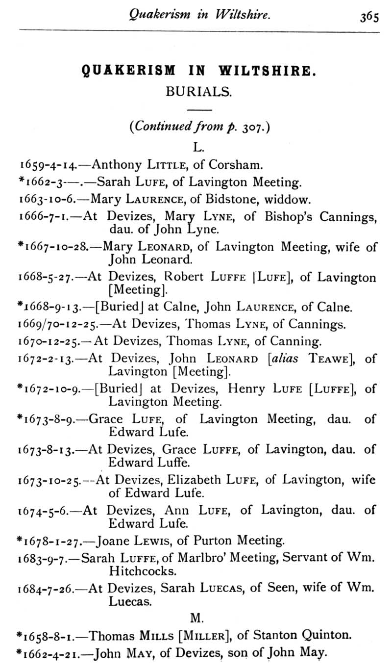 Chapter 9 Lacock Abbey; Records of Wiltshire Parishes: Urchfont with Stert; Eyre of Wilts; Stokes; Feet of Fines; Wiltshire Wills; Quakerism in Wiltshire; J. Aubrey's \"Remains of Gentilisme and Judaisme\" 1687; Registers of Somerset House Chapel 1712-1775; Queries;