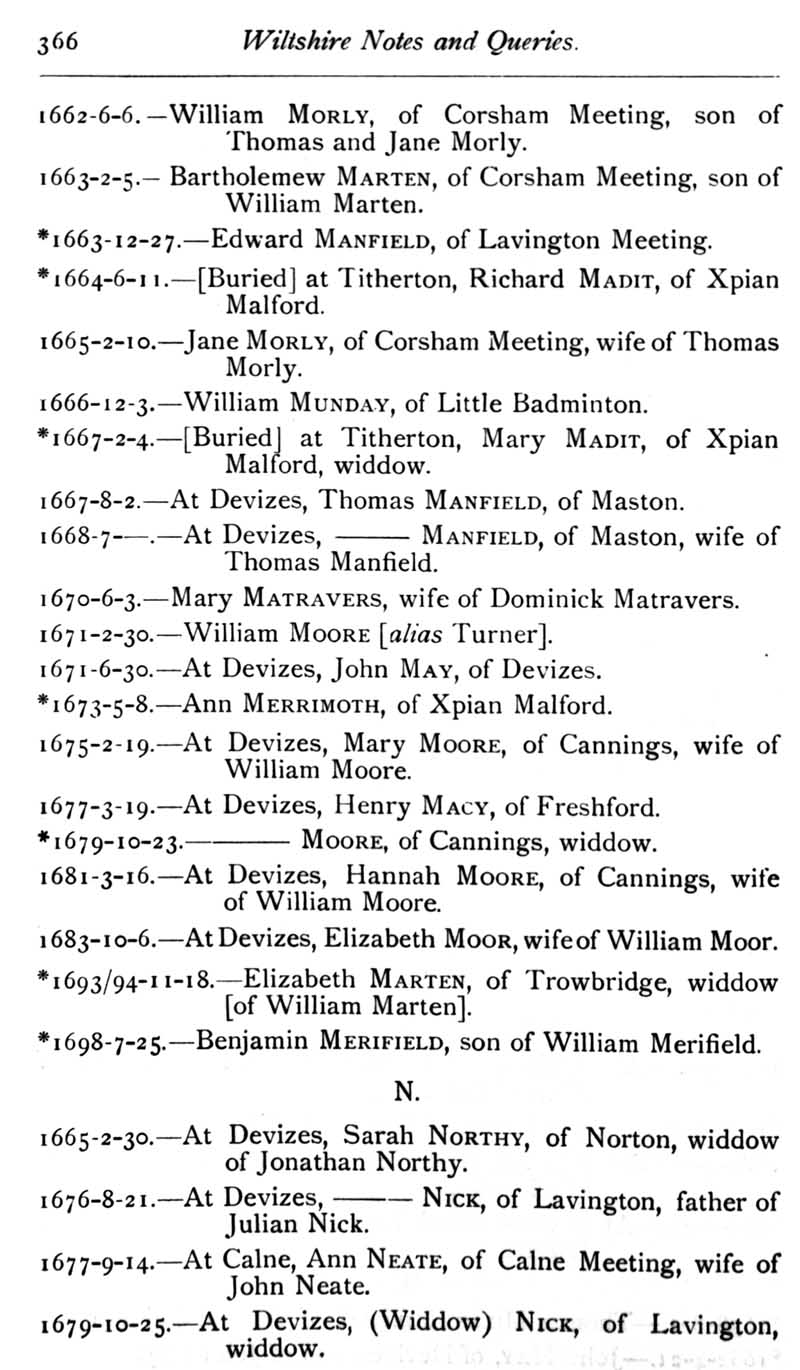 Chapter 9 Lacock Abbey; Records of Wiltshire Parishes: Urchfont with Stert; Eyre of Wilts; Stokes; Feet of Fines; Wiltshire Wills; Quakerism in Wiltshire; J. Aubrey's \"Remains of Gentilisme and Judaisme\" 1687; Registers of Somerset House Chapel 1712-1775; Queries;