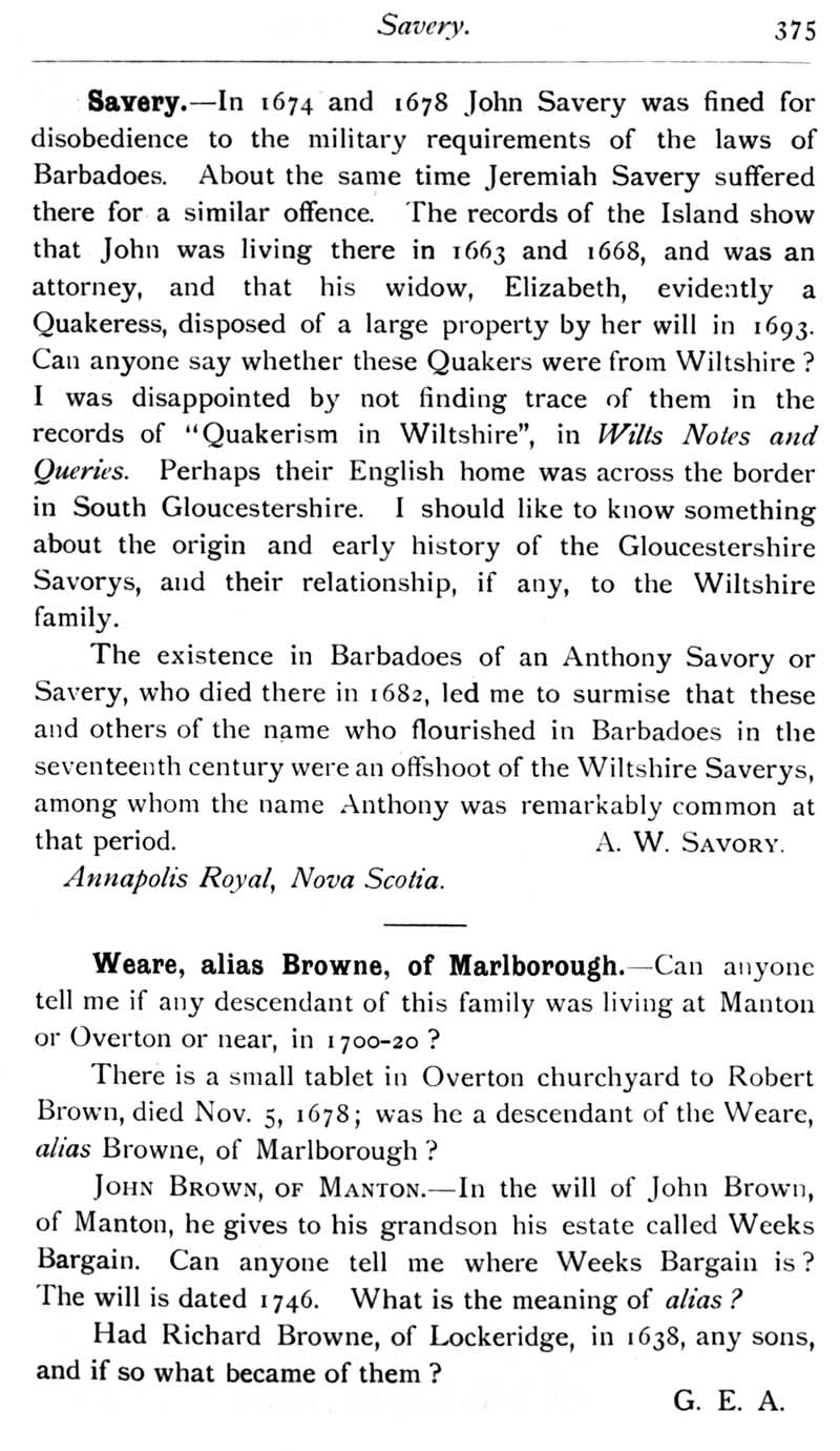 Page 40 Queries: Savery; Weare, alias Browne of Marlborough