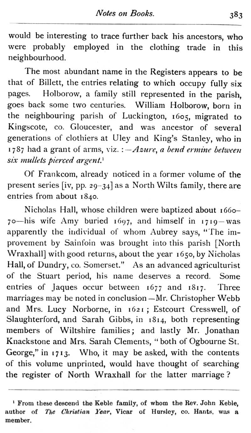 Chapter 9 Lacock Abbey; Records of Wiltshire Parishes: Urchfont with Stert; Eyre of Wilts; Stokes; Feet of Fines; Wiltshire Wills; Quakerism in Wiltshire; J. Aubrey's \"Remains of Gentilisme and Judaisme\" 1687; Registers of Somerset House Chapel 1712-1775; Queries;