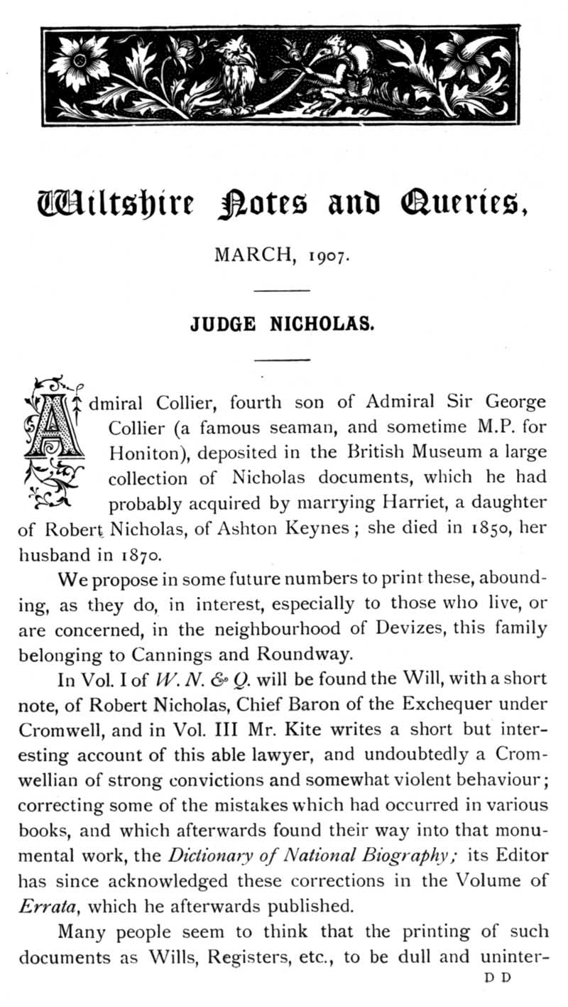 Chapter 10 Judge Nicholas; Stokes; Records of Wiltshire Parishes; Quakerism in Wiltshire; Burials near the Gallow's Ditch; Wiltshire Wills; Eyre of Wilts; Grant of Arms to John Skutt, 1546; John of Salisbury; Queries; Replies; Notes on Books.