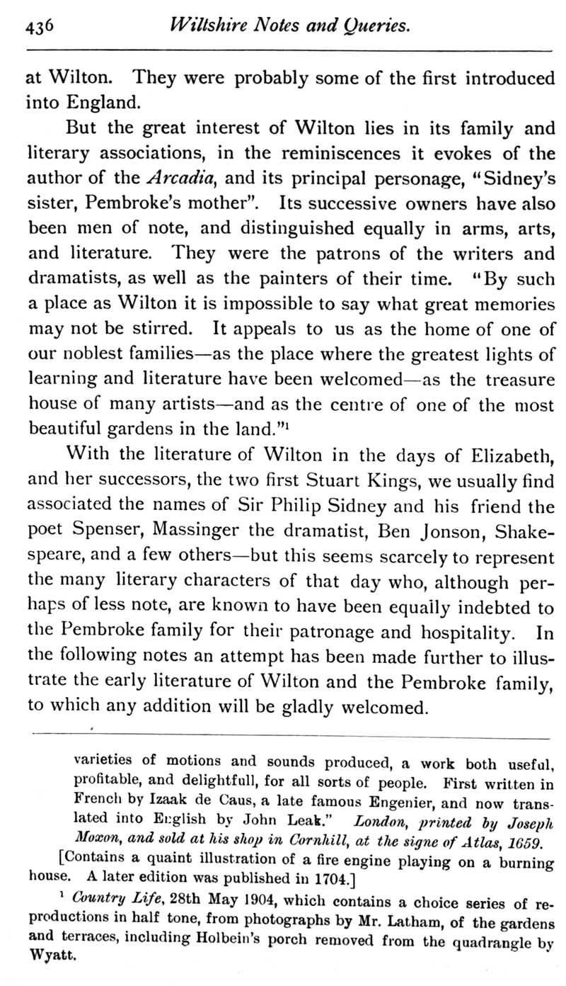 Chapter 11 Wilton House and its Literary Associations; Records of Wiltshire Parishes; Quakerism in Wiltshire; Wiltshire Wills; Stokes; The Chrysom Book of St Thomas, New Sarum; Eyre of Wilts; Dugdale of Seend; Tom King's Coffee-House; Queries; Replies; Notes on Book