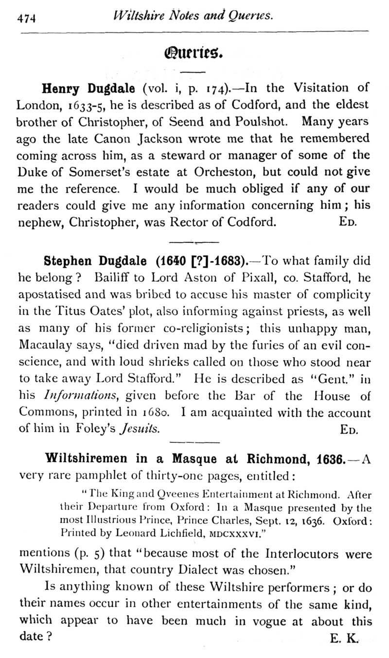 Page 43 Queries: Henry Dugdal, Stephen Dugdale; Wiltshirmen in a Masque at Richmond, 1636.