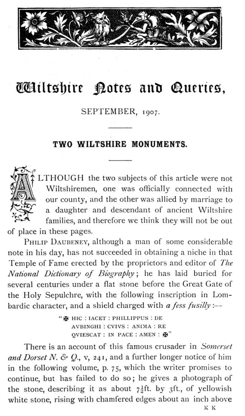 Chapter 12 Two Wiltshire Monuments; Records of Wiltshire Parishes: Urchfont with Stert; Wiltson House and its Literary Associations; Stokes; The Chrysom Book of St. Thomas, New Sarum; Quakerism in Wiltshire; Wroughton, Sadler Monumental Inscriptions; Wiltshire Wills