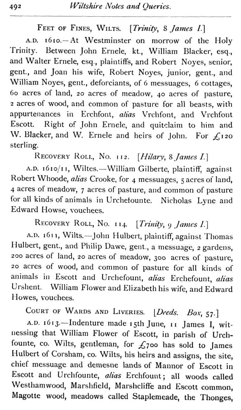 Chapter 12 Two Wiltshire Monuments; Records of Wiltshire Parishes: Urchfont with Stert; Wiltson House and its Literary Associations; Stokes; The Chrysom Book of St. Thomas, New Sarum; Quakerism in Wiltshire; Wroughton, Sadler Monumental Inscriptions; Wiltshire Wills