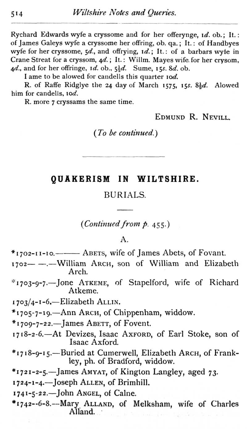 Chapter 12 Two Wiltshire Monuments; Records of Wiltshire Parishes: Urchfont with Stert; Wiltson House and its Literary Associations; Stokes; The Chrysom Book of St. Thomas, New Sarum; Quakerism in Wiltshire; Wroughton, Sadler Monumental Inscriptions; Wiltshire Wills