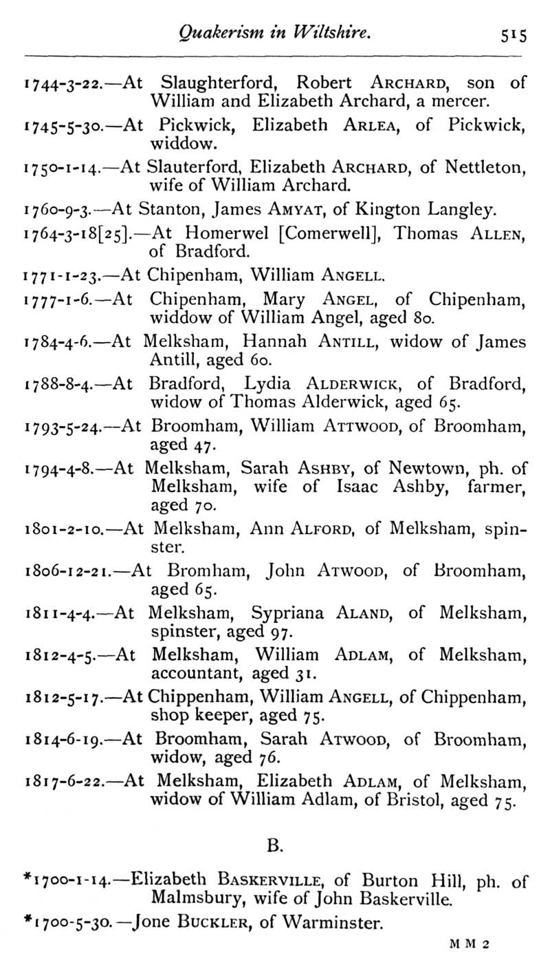 Chapter 12 Two Wiltshire Monuments; Records of Wiltshire Parishes: Urchfont with Stert; Wiltson House and its Literary Associations; Stokes; The Chrysom Book of St. Thomas, New Sarum; Quakerism in Wiltshire; Wroughton, Sadler Monumental Inscriptions; Wiltshire Wills
