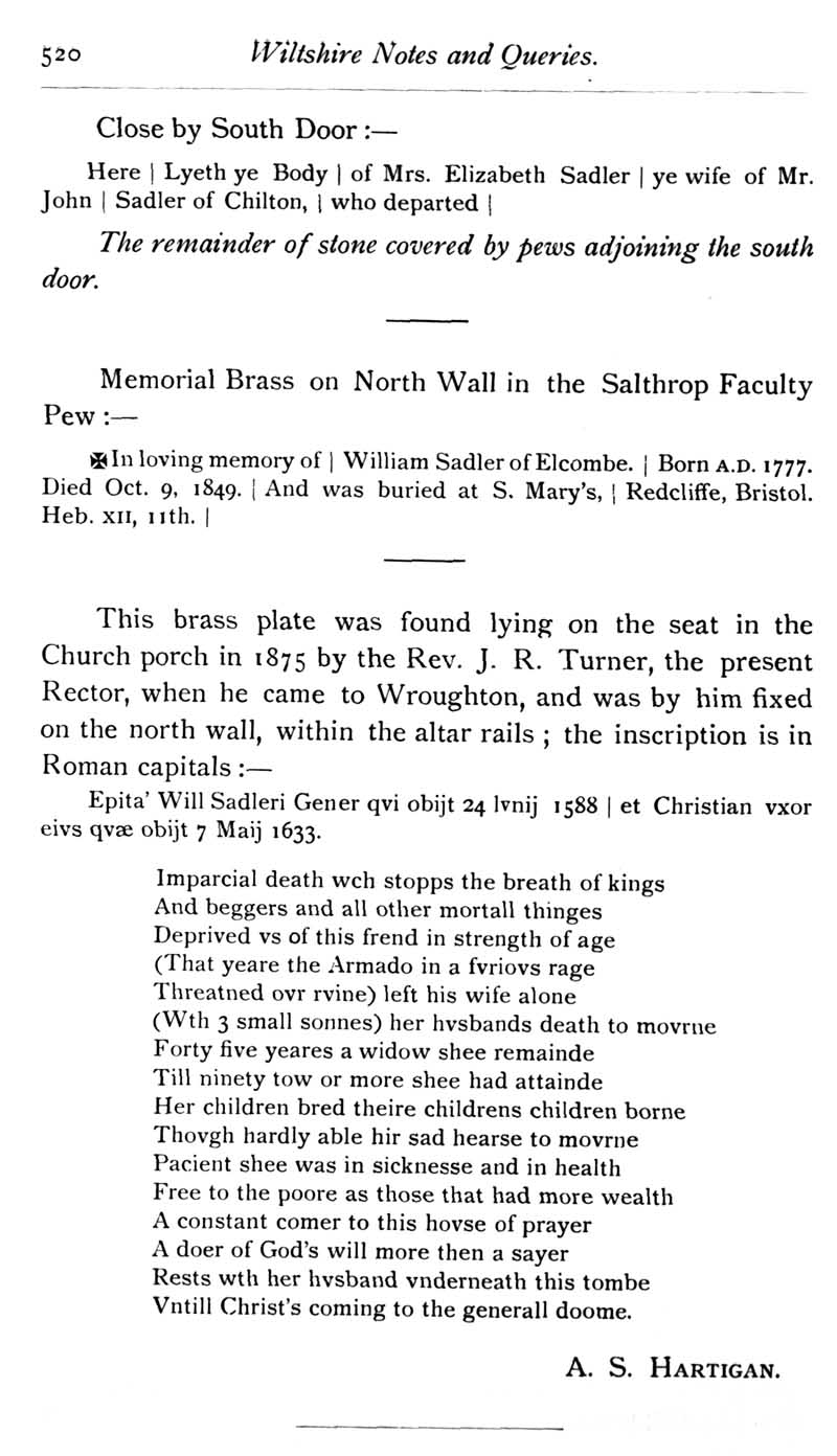 Chapter 12 Two Wiltshire Monuments; Records of Wiltshire Parishes: Urchfont with Stert; Wiltson House and its Literary Associations; Stokes; The Chrysom Book of St. Thomas, New Sarum; Quakerism in Wiltshire; Wroughton, Sadler Monumental Inscriptions; Wiltshire Wills