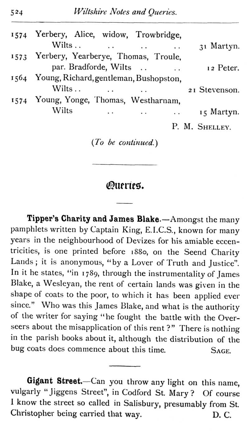 Page 45 Wiltshire Wills; Queries: Tipper's Charity and James Blake; Gigant Street