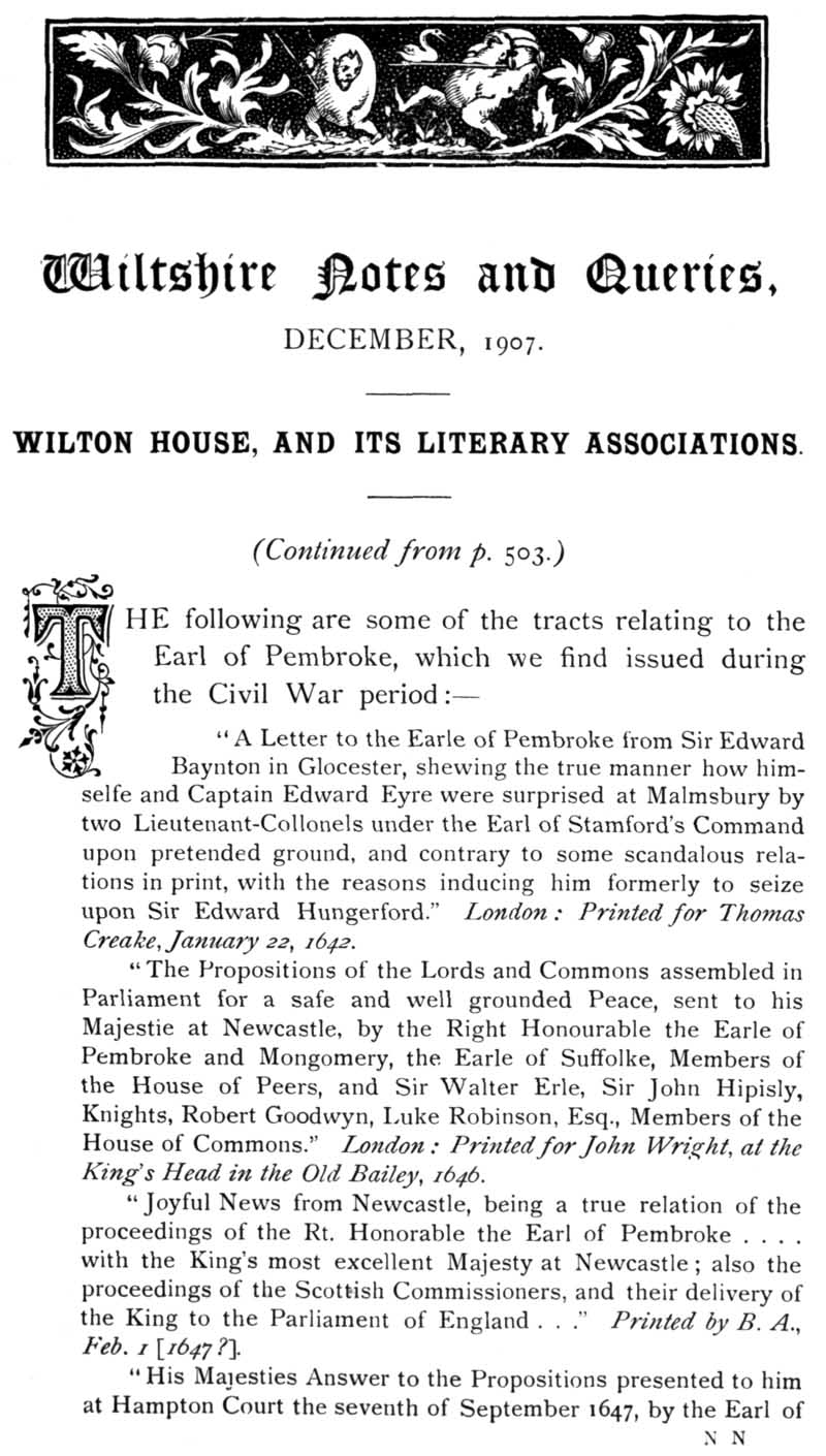 Chapter 13 Wilton House and its Literary Associations; Records of Wiltshire Parishes: Urchfont with Stert; Quakerism in Wiltshire; Stokes; The Chrysom Book of St Thomas, New Sarum; Feet of Fines for Wiltshire; Wroughton Registers, Sadler; Queries.