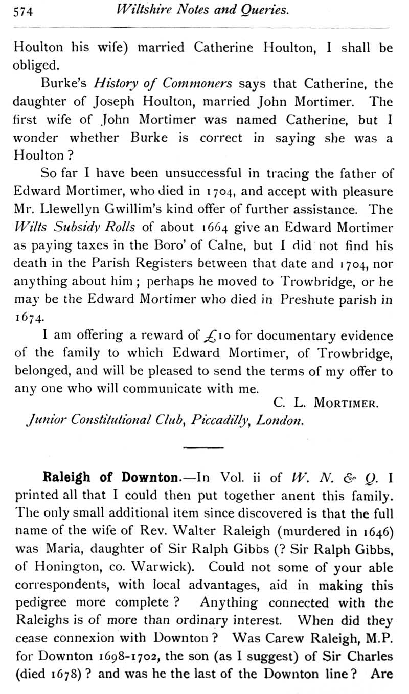 Page 46 Queries: Mortimer of Trowbridge; Raleigh of Downton