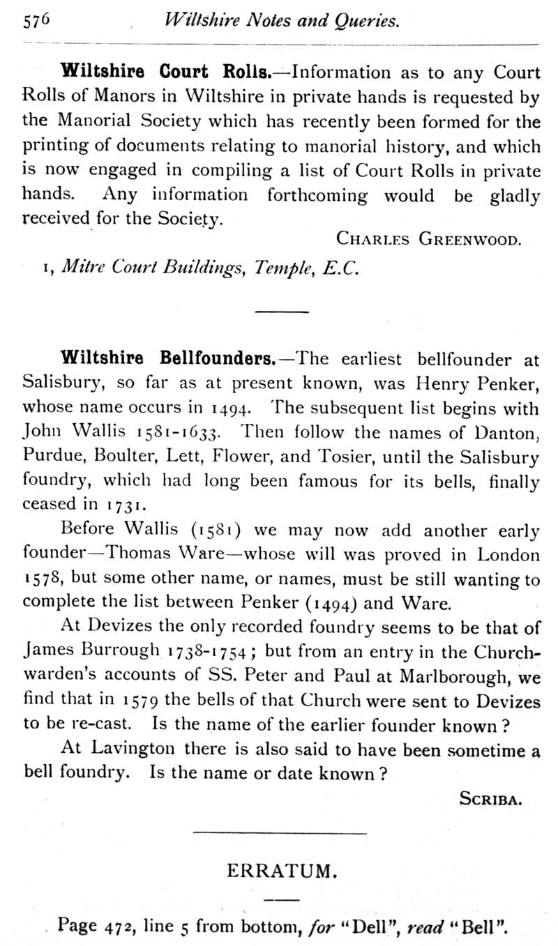Page 48 Queries: Wiltshire Court Rolls; Wiltshire Bellfounders