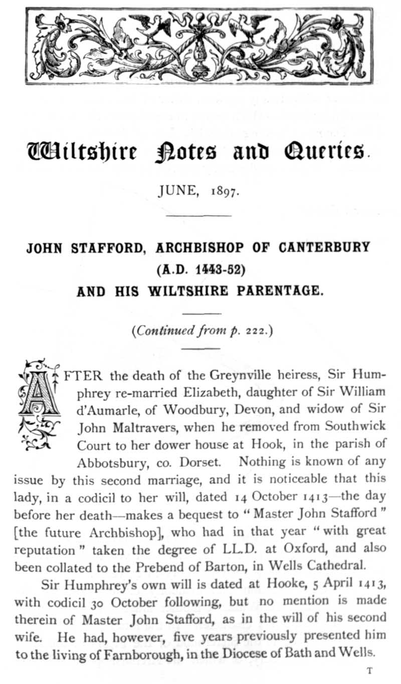 Page 2 Wiltshire ancestry of John Stafford, Archbishop of Canterbury 1443-52. Southwick Court, North Bradley.