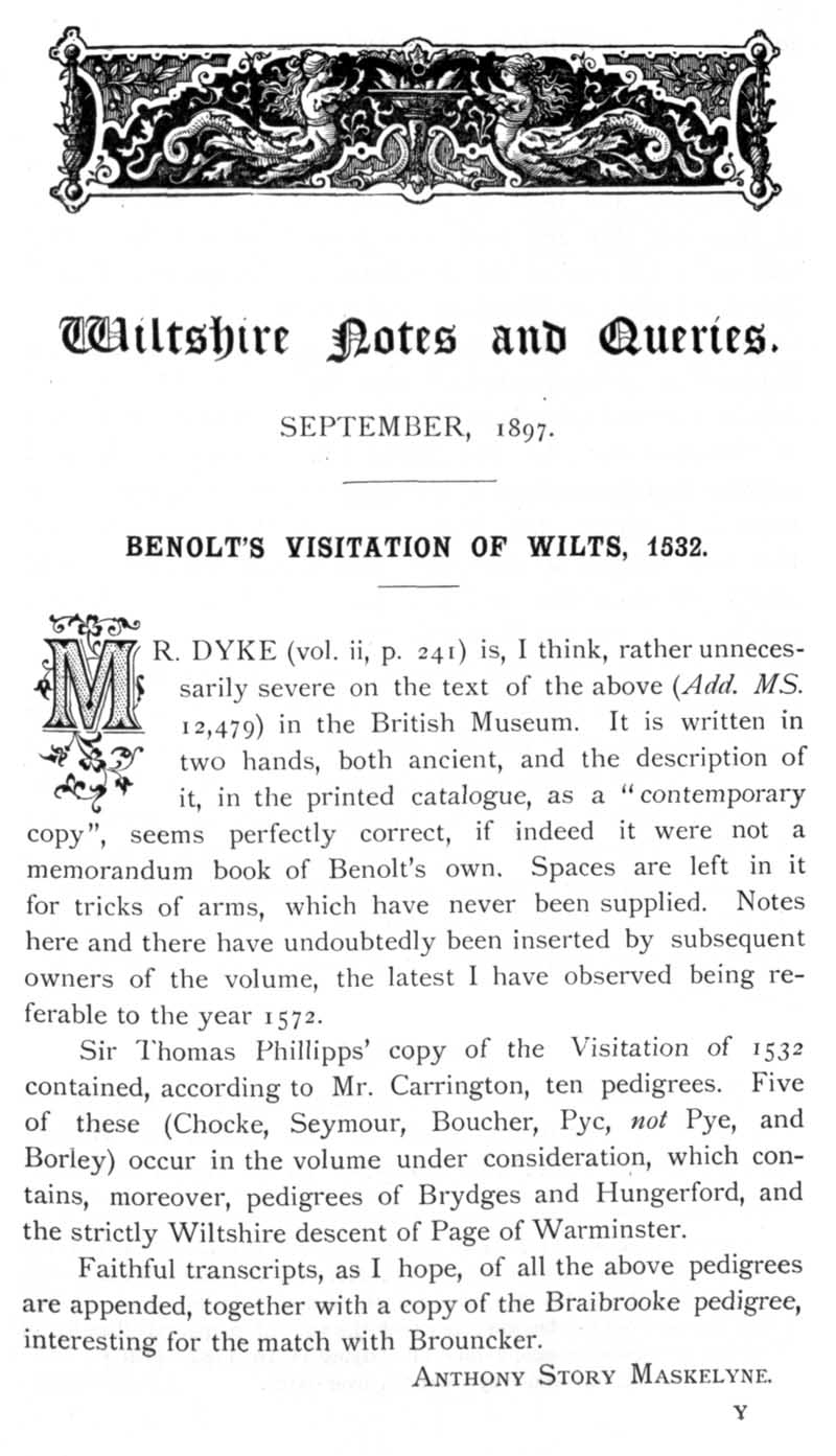 Page 2 Benolt's Visitation of Wiltshire, 1532.